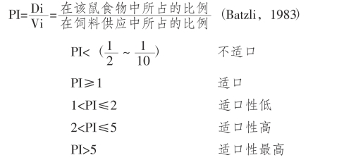 近年来评价植食性哺乳动物食物组成与饲料可利用量之间关系的方法很多(Lechowice,1983),如对田鼠类采用选择性指数(Preference lndex,PI)分析二者关系的各种模式。其模型如下: