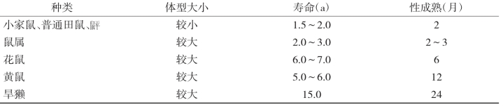 性成熟是指生殖器官已发育完成并开始具有生殖能力。各种鼠类自出生后达到性成熟的年龄极不一致(雌性比雄为早)。这与动物的寿命和体型大小有关(表1-1)。