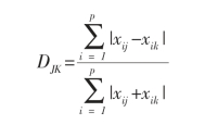 式中,i为物种数,i=1,2,3,……p,j,k为群落(或样方)数,j=k=1,2,3,……n;Djk为群落(或样方)j和群落(或样方)k之间的距离系数;xij,xik为物种i在群落(或样方)j和群落(或样方)k中组成比或密度。