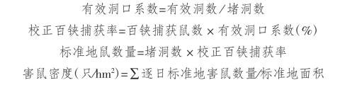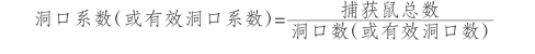 洞口系数的调查,必须另选与统计洞口样方相同生境的一块样方,面积为0.5~1.0 hm2。先在样方内堵塞所有洞口并计数(洞口数),经过24 h后,统计被鼠打开的洞数,即为有效洞口数。然后在有效洞口置铗捕鼠,直到捕尽为止(一般需要3 d左右)。统计捕到的总鼠数,此数与洞口或有效洞口数的比值,即为洞口系数或有效洞口系数。