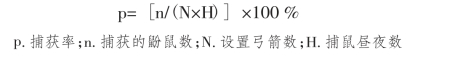 公式中,P为铗日捕获率(%),n为捕获鼠数(只),Cl为布铗总数(铗),T为捕鼠昼夜时间(d)。