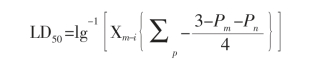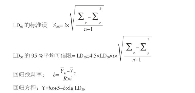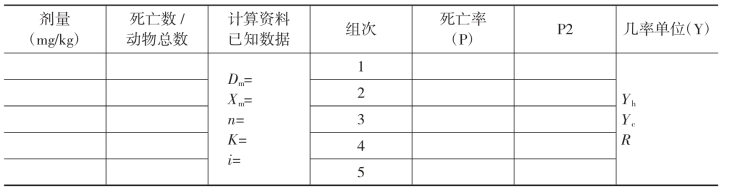 注:Dm,估计最大致死量;Xm,Dm的对数值;n,每组动物数;K,组数;i,组间剂量比例的对数;Yh,高半组Y值的均数;Yc,低半组Y值的均数;R,Yh与Yc间的组距数。