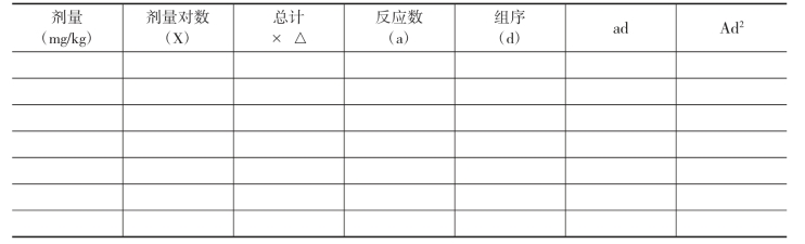 (1)孙氏综合法(点斜法)测定前,需进行预实验,目的是找到一个0死亡的最大剂量和100 %死亡最小剂量的估计值,以决定实验中采用的最大剂量(Dm)和最小剂量(Dn)。