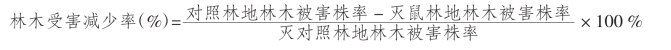调查林木被害减少率时,需要设不灭鼠的对照地,灭鼠地灭鼠后,直到害鼠危害时期基本结束后,调查灭鼠地和对照地相同数量林木株数,一般应在300株以上,记录被害株数,计算灭鼠后林木受害减少率: