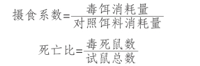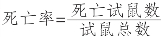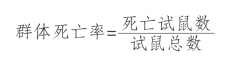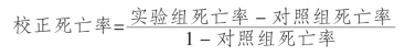 死亡率表示在试验过程中实验组试鼠的死亡情况,它反映了含毒饵料对试鼠总的毒杀情况,但它不能排除试验过程中的误差,既在试验过程中由于其他因素引起试鼠的死亡情况,采用校正死亡率表示的试验结果可以排除由于其他因素造成的试验误差。校正死亡率按以下公式计算。