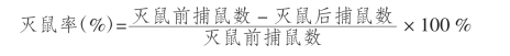 ●鼠铗法在灭鼠前24 h,在样地内放鼠夹100个以上,24 h后检查捕鼠数,灭鼠若干天(一般3~7 d)后,用同样方法、同型号、同夹数,同样诱饵,在同一时间进行捕鼠,24 h后检查,记录捕鼠数,计算灭鼠效果,用捕鼠率表示: