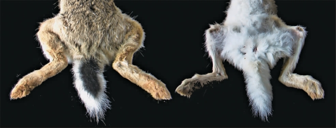 兔科种类的尾短,尾毛长,因此从外观上看,兔类的短尾呈毛簇状。奔跑时,尾翘起,尾面靠近体背,有助于减少空气阻力;求偶时,尾摆动,若尾背与尾底毛色不同时,如草兔尾背白色中央有个大的黑纵斑,尾腹毛色纯白,对异性有诱惑作用,面性分泌物气味溢散,诱惑力随尾摆动更增强(图2-138)。