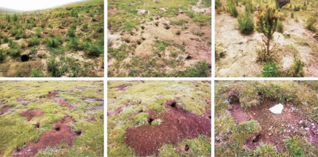 上排照片为青海云杉和青蒿危害情况,下排为草场鼠洞与土丘