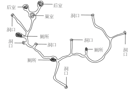 (2)后室位于巢室之后。后室2个,雌性分居。比巢室略深或在同层,也呈圆形或者扁圆形,室内也有睡垫。