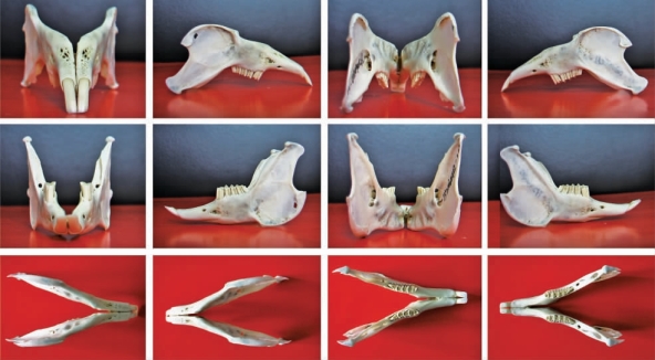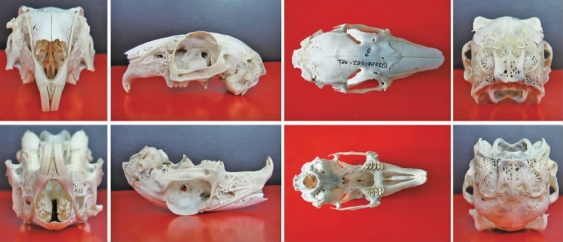 ●头骨鉴别颅骨上面弧度较为明显,上颌骨两侧具有明显的骨质网状构造,鼻骨向后扩大,有眶上突,颧骨略为伸出鳞骨突后方。眼眶近乎垂直,两眼各朝向外侧,因而视野较广。额骨在眶间略为凹陷。门齿孔很大,与腭孔汇合。硬腭主要由上颌骨构成,呈一狭窄骨桥。听泡小,长不到颅长的16 %,内无海绵状组织,外耳道管状。颊齿列外侧呈弧形,最后上臼齿很小,门齿四周均被以珐琅质,第1对上门齿齿端切缘各有2个不甚明显的弧形齿突,正面看4个齿突均在或几乎在同一直线上。下颌骨后部甚为发达;髁突和隅突较大,冠状突退化(图2-141~图2-143)。