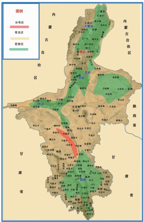 【亚种及分布】分布于内蒙古、河北、山西、陕西、甘肃、四川、青海、宁夏、西藏等地。国外分布于苏联、蒙古、锡金和伊朗。记载有7个亚种,中国3个亚种。其中,指名亚种(O.d.daurica(Pallas),1776)分布于内蒙古、宁夏、河北等地;山西亚种(O.d.bedfordi Thomas,1908)分布于山西宁武、岢岚和陕西延安等地;甘肃亚种(O.d.annectens Miller,1911)分布于甘肃兰州东部、青海西宁东北部及海南地区的共和、兴海、贵德、贵南、龙羊峡等地,四川西北部的邓柯、德格、甘孜和西藏东部也有分布。宁夏境内,达乌尔鼠兔指明亚种分布于泾源县、隆德县、彭阳县、西吉县、原州区、海原县、同心县、盐池县和中卫市等,主要栖息于典型草原和草甸草原(图2-152)。