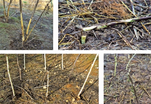 本世纪初期以来,草兔数量在西北、华北及东北地区迅速增加,仅陕甘两省草兔种群数量就达2 000万~3 300万只,给当地农林牧业生产造成了巨大的损失。草兔危害通常集中发生。在同一区域或同一片林地内,有的地块几乎每株树都被啃食;在造林地里,草兔顺行顺垄一株一株地啃咬,边吃边拉,林地兔道、爪印和兔粪随处可见,成百上千亩的林木被啃食为害;局部区域甚至出现了“边栽边吃,常补常缺”的现象(图2-147)。其危害分为以下4种类型: