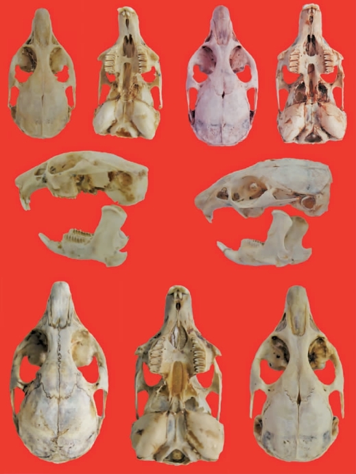 头骨特征颅全长一般不超过90 mm。鼻骨较长,前窄后宽,其最大长度大于额骨中缝之长,其后端宽大于眶间宽和上齿列长;鼻骨形态和后缘分化严重。额骨前部较平坦,两侧边缘斜向上翘起,后部隆起。眶上突发达,形态各异,前支较小,后支较大。顶骨微隆,成体的顶间骨无明显界线。枕骨斜向后倾,上方中部有一略成长方形的枕上突。颧弓平直,其后端略向后上方倾斜。门齿孔长,其后部较宽。腭桥长小于翼骨间宽。听泡不大,长略小于左右听泡间距。下颌关节面较宽大。上门齿2对,前1对较大,后1对门齿较小,唇面的纵沟较浅,里面几乎没有白垩质沉积;呈椭圆柱状。第1上前臼齿较小且短,前方具有浅沟。第2~5颊齿的咀嚼面由2条齿嵴组成,齿侧嵴间有沟。最后1枚臼齿呈细椭圆柱状。下颌门齿1对,第1下前臼齿的前方具有2条浅沟,其咀嚼面由3条齿嵴组成(图2-145)。
