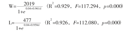 ●个体生长与发育草兔初产时的体重,春季2~3月为109.8(96.4~113.2)g,4~5月为88.7(79.6~105.0)g,6~7月为84.9(81.5~91.0)g,8~9月为92.7(86.9~103.1)g。其体重(W)和体长(L)的日(d)发育进程符合Logistic模型变化: