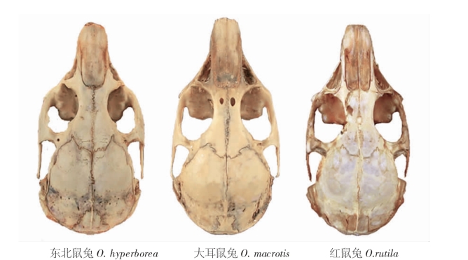 1.体较大,体长一般在300 mm以上,尾短;耳通常狭长;后肢明显比前肢长,颊齿通常为6/5;脑盒呈拱形;眶上突很发达,鼻骨向后扩大,颧骨略为延伸到鳞骨突后面。第1对上门齿齿端切缘各有2个不甚明显的弧形小齿突,外侧的较宽,左右门齿共形成3个很浅的缺刻,4个弧形小齿突正面几乎在同一直线上…………………………………………………………………………………兔科(Leporidae)体较小,体长不超过300 mm,无尾或仅保存一小突起,耳圆短;前后肢均短,后肢稍长于前肢;颊齿5/5;脑盒扁;眶上突缺如或退化成一点痕迹;鼻骨向前扩大;颧骨后端细长而尖,远伸出鳞骨突后面。第1对上门齿齿端切缘各有2齿尖,外侧的明显较内侧的宽长,正面观,左右门齿内外侧齿突明显不在一条直线上…………………………………………………………………………鼠兔科(Ochotonidae)
