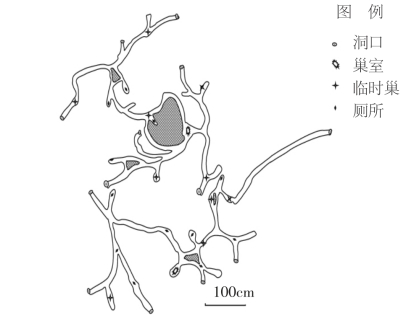 (1)简单洞即为临时洞,是为临时休息和排泄用的。洞道较短,多数长不足100 cm,但也有达520 cm以上的。洞道有分支,洞内有巢室和厕所。巢室为洞内扩大部分,供休息用,但没有睡垫。简单洞有洞口1~2个,最多4个;洞口大小5.5 cm×4.7 cm。洞顶距离地表17.2~27.0 cm。
