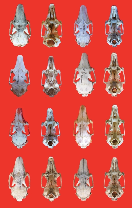 测量指标/mm与形态测量一样,草兔成年个体头骨测量特征也存在着明显的地区差异。陕西关中颅长85.49±3.47,鼻骨长36.65±2.20,颧宽40.22±1.29,眶间宽17.34±1.20,听泡间距12.59±0.77,齿虚位宽23.76±1.41,上齿列长42.09±1.92。