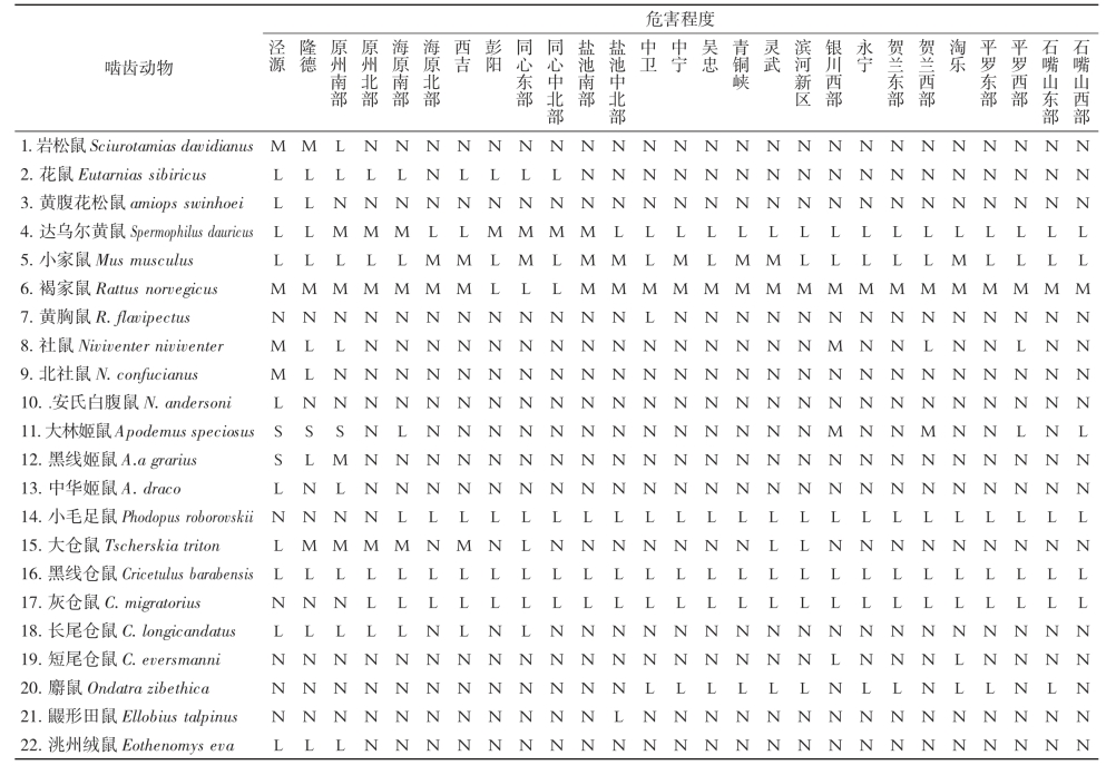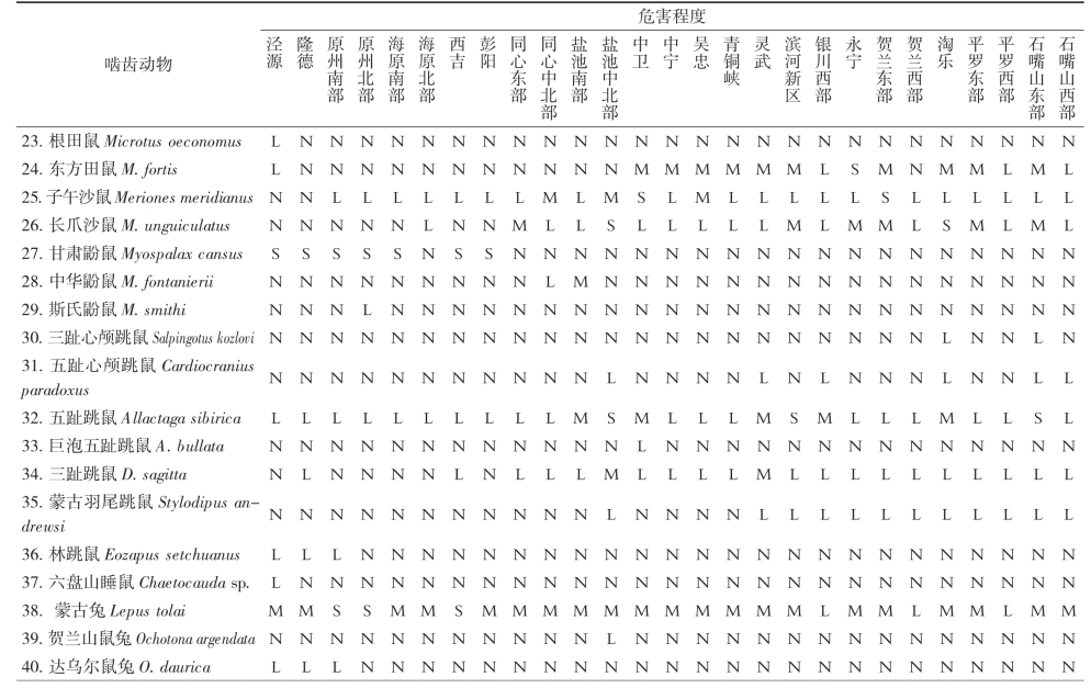 续表3-2 宁夏啮齿动物种类及其危害程度