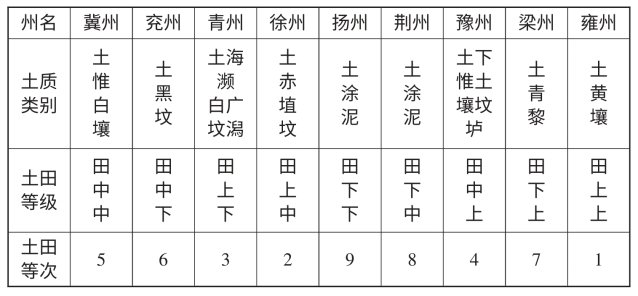 《禹贡》在九州的记载中,每一州都记载了土壤的类别和田地的等级,这在中国历史上是首次,自然在历史自然地理的研究中具有开创之功。现将简况列表如下: