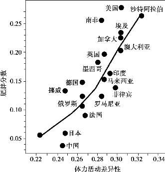 图1.2 不同国家体力活动差异性与肥胖分数关系