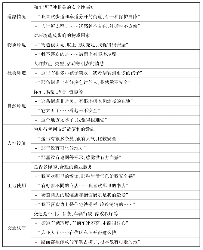 从访谈表格内容可以看出,受访者主观感知的安全性影响因素主要集中在道路、环境、管理3个方面,这与国内学者(张殿业,2005)的研究一致。他们认为步行的安全性受到由人、车、道路、自然环境、人为环境和管理等要素构成的复杂动态系统的影响,人、车是主观可控制变量,道路、自然环境、人为环境和管理是不可控制的客观变量。步行的安全性在很大程度上取决于道路、环境、管理3项客观要素。