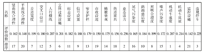 对交通秩序、环境舒适度、违法占道3个二级指标的10个三级指标的重要性进行问卷调查。共发放问卷500份,有效收回问卷416份。当被问及哪个因素最能影响步行安全时,有31.8%选择“业态活力”,有26.3%选择“机动车速度”,有21.1%选择“违规占道停车”,剩下7项因素占20.8%。可见,业态活力、机动车速度、违规占道停车的确是影响步行安全性的最重要因素。