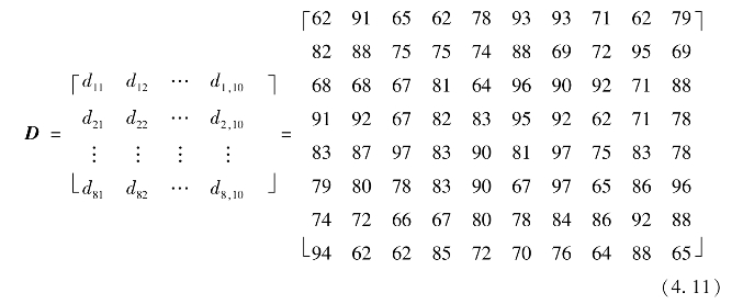 根据平均值统计数据,得到10条街道(编号为1~10的街道)的8项评价指标取值的样本矩阵D。