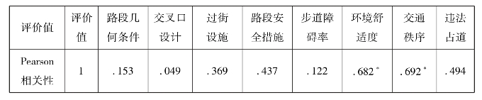 本文用SPSS软件对10条街道合计500份问卷做相关性分析,其对象为步行安全性与8项二级影响因素,结果表明(表4.26):①各个影响因素都会对街道步行安全的评价值产生影响,但影响程度不同;②交通秩序(p=.692)与评价值最相关,说明最受步行者关注,其次是环境舒适度(p=.682)、违法占道(p=.494);③交叉口设计、路段几何条件、步道障碍率等对安全性影响较小;④不同街道的相关性程度呈现类似特点。