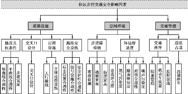 根据相关研究,本文从道路设施、空间环境、交通管理3个方面对住区步行交通安全影响因素进行分析,如图4.4所示。