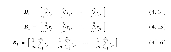 由样本矩阵D和隶属函数μ得到评价值关系矩阵R:Q×U→[0 1]:模糊向量A={a1a2… am},aj代表各项指标关于第一级评价的相对重要程度系数。假设各项指标在评价中的地位无显著差异,故对模型Bj(j=1,2)取a1=a2=…=am=1,对模型Bj(j=3)取a1=a2=…=am=1/m。可得到3种综合评价模型:
