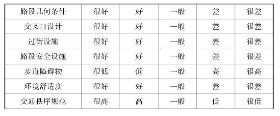 ①道路设施:步行安全水平与道路条件存在密切关系。基于以下方面考虑:道路几何条件、交叉口设计、过街设施、路段防护设施。