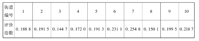 由表4.23可知,10条街道(1~10)的步行安全性由高到低的编号排序大致如下:7,6,10,9,2,5,1,4,8,3(编号见图4.3)。此评价结果与受访者的评价意见较为符合,说明本文建立的评价指标体系是合理的。