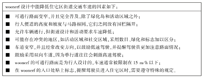 已有研究表明,机动车速度对居民交通性步行出行、购物性步行出行、休闲性步行出行都有显著的负相关性。限制机动车速度是宜步行的住区环境建设的关键环节。荷兰采用了一种称为“woonerf”的慢速交通理念,通过设计街道的方法使车速降低,增进安全、环境和生活质量。趋向于减慢车速的设计要素包括绿化岛、坡度变化、街道宽度变化、道路弯曲等。woonerf街道布局创造了具有特色的街道景观,促进了居民之间的交往,因而受到热烈欢迎,许多欧洲城市的街道都从传统的布局转向woonerf(托马斯,2002)。建议采用woonerf的基本做法来限制机动车速度,创造适合居民步行出行的安全舒适的住区街道环境,如图4.6和表4.27所示。