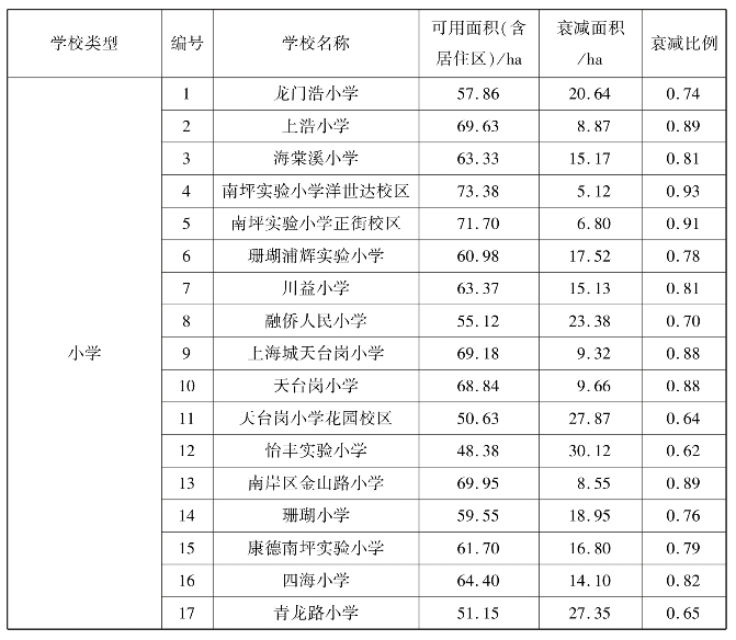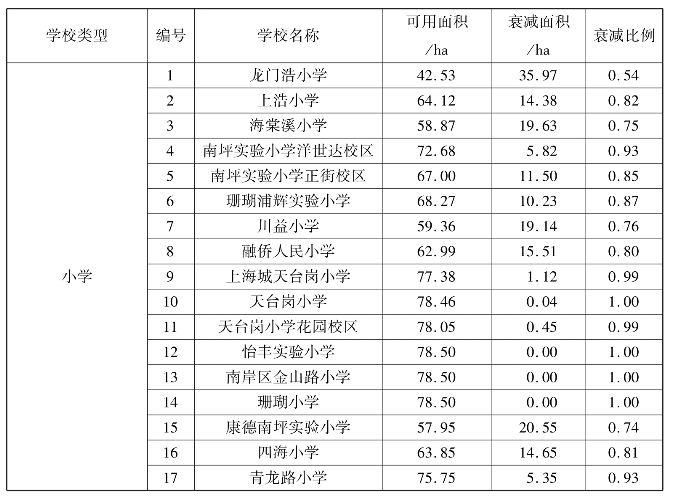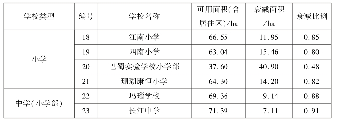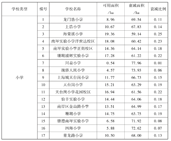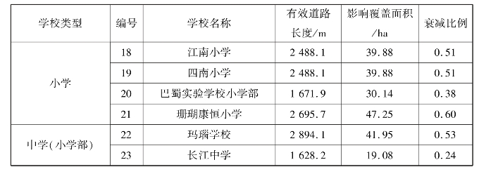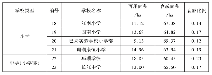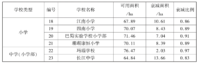 而针对每个学校,表现出不一样的衰减比例,其中衰减最为严重的是15号康德南坪实验小学,其比例仅为0.08(数值越低,其衰减度越高),即只有原有覆盖面积的8%,而衰减最弱的3号海棠溪小学其衰减率为0.25(数值越高,其衰减度越低),即只有原有覆盖面积的25%(表5.23、图5.41)。