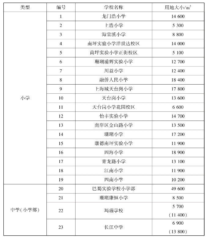 表5.7 南岸区南坪片区小学(含中小学)统计一览表