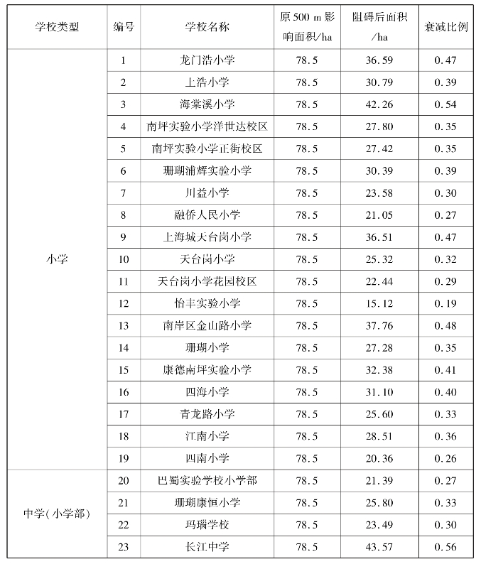 表5.19 各小学城市空间(用地)阻隔下衰减一览表
