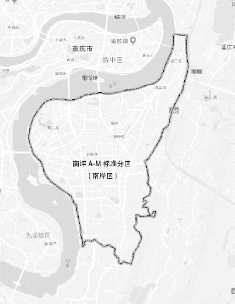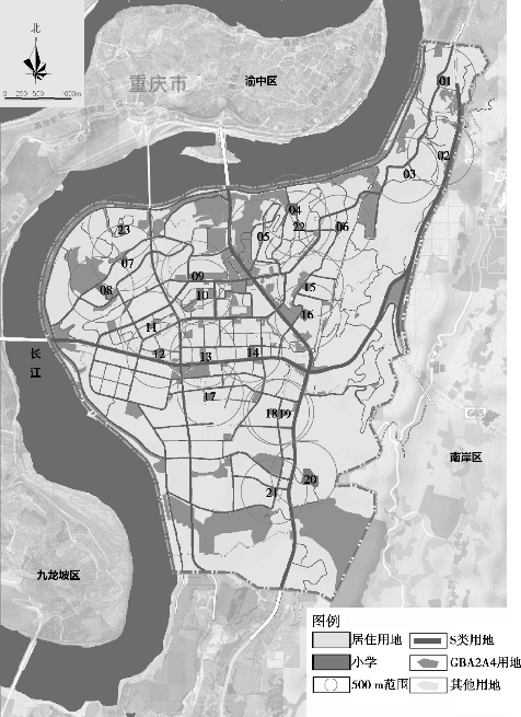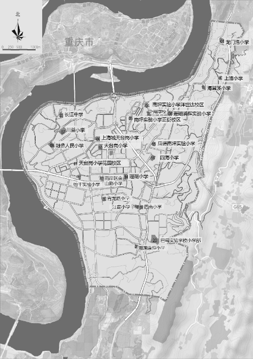 南岸区区位条件优越,对外辐射川、黔,是重庆主城区的东部门户;对内地处主城区“黄金三角”,拥有南坪、茶园两大城市副中心,是山地重庆最具代表性的地区之一。其中的南坪组团作为重庆市最早开发且较为成熟的现状主城区之一,组团内路网成熟、学校配套设施较为完善,属于城市发展较为成熟的地段,是实证研究较为理想的区域。研究以重庆市南岸区南坪的A-M标准分区为范围,共计28.4 ha(0.284 km2),作为可达性研究的具体地段。此地段西邻长江,东接铜锣山山系,北侧呈收缩状较为狭窄,南侧则紧邻城市山体公园,内部共有23所小学(包含2所中小学),居住用地分布较均匀,覆盖了足够多的居住区,保证研究结果的可靠性,同时,研究区域虽受地形水体等多方面因素影响,但受周边地块影响较小,较为独立,便于研究。