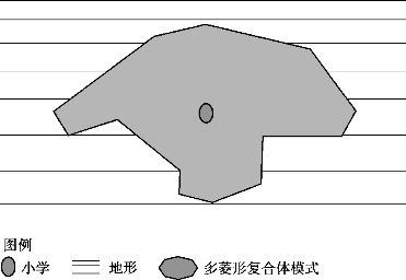 最后,受到其他多种要素的阻隔,过渡为多菱形复合体。城市是复杂且多变的,这正是城市魅力所在,但往往会产生对小学等公建步行网络可达性具有影响的外部要素(图5.46)。除了城市道路、城市山体以外,城市用地阻隔、其他小学以及水体会不定向地产生影响,在这些影响下,小学步行网络可达性的范围最终呈现出不规则的多菱形复合体(图5.47)。