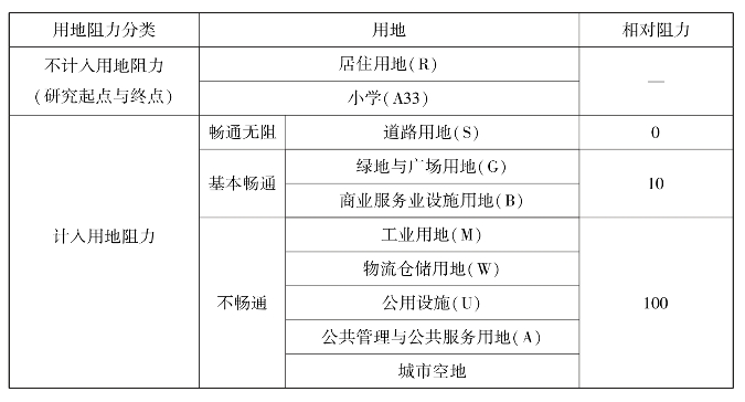 很多案例中都说明了各类用地的阻力指数,研究发现,用地阻力种类如果划分过多,则不便于研究,很多也不符合实际使用情况。因此,本研究将居住用地(R)与小学(A33)作为研究的起点与终点,不列入用地阻力体系中,对于居住用地(R)与小学(A33)不同地块之间的影响,经过详细踏勘后发现,南坪组团内的居住用地大多数分为两类:一类是在早期由于工业发展或者行政单位建设计划体制下“单位大院大院式”居住区,这种形式往往形成了封闭大街坊(gated-super-block)。另一类是在现今市场经济体制下,受社会阶层分开影响而导致的空间隔离,从而形成封闭大街坊。2006年一则“母女没出入证横穿小区被阻遭居民围殴”新闻事件背后所表现的深层次原因就是社会阶层不同导致居住空间的隔离的典型案例。在当今社会,伴随物权的私有,社会阶层之间的贫富差距不断扩大,在多数街区均使用的是封闭式管理方式,公共环境的内向化逐步被要求,而处于自身考虑的安全需求也越发强烈(邹德慈,2006),这种趋势往往会造成步行交通的非连续性。因此本研究认为,大多数居住区均是封闭的,是不容许外来者随意进出的,另外,居民对其他小区缺乏了解,日常也不会选择在这些地段进出。因此,本研究将居住用地定义为起点不列入用地阻力体系中,另外则将居住区之间的影响列为互相不能通过的类型。其次参照案例分析并结合多种用地性质的定性分析,采用层次分析法进行类比,对其他几类重要的用地阻力进行划分。一是道路用地(S),主要指城市主干路、城市次干路、城市支路也包含道路之间的交叉口。单纯从物质空间理论上,可以认为道路用地是专门用于用地之间的联系的,是专为车辆和人流通行的道路,也可以认为道路用地是不受任何阻碍的,人们可以自由地在道路人行道(几乎所有道路都会设置人行道)上行走,因此将道路用地的相对阻力定义为0。二是工业用地(M),指工矿企业的生产车间、库房及其附属设施用地,包括专用铁路、码头和附属道路、停车场等用地,不包括露天矿用地。物流仓储用地(W)的定义是物资储备、中转、配送等用地,包括附属道路、停车场以及货运公司车队的站场等用地。公用设施(U)的定义是供应、环境、安全等设施用地,这3类用地相对其他用地,往往涉及一些安全隐患,因此各个单位通常采用封闭式的管理,一方面保护住户财产,另一方面也减少对外来者造成不必要的伤害,因此行人也不能通过这些区域,通过实地踏勘观察也证实了这种情况。因此,可将第二大类用地定义为不可通过用地,相对阻力定义为100。三是公共管理与公共服务用地(A),指行政、文化、教育、体育、卫生等机构和设施的用地,不包括居住用地中的服务设施用地,这类用地本属于城市公共设施,是可以供任何人使用的,但往往为了便于管理(收费需要、安全保障、形象保障)一般都采用封闭式大院形式,步行者均不可步行通过,通过实地踏勘观察同样证实了这种情况,因此将这类用地定义为不可通过用地,相对阻力定义为100。四是城市中存在部分城市空地,因为城市空地是城市待开发的区域或者城市荒地,具有很多不稳定不确定的安全隐患,一般家长也不会容许小学生通过这类区域,因此本研究将其定义为不可通过用地,相对阻力定义为100。五是绿地与广场用地(G),指公园绿地、防护绿地、广场等公共开放空间用地,这类用地相对其他用地来说具有较强的公共性,尤其是当今城市中绝大多数公园与广场均是不收费的,更加强化了这些场所的公共性,但是考虑到公园和广场设计时需要注重场所的趣味性和参与性,往往路径会曲折一些,且会设置一些城市小品雕塑等景观构筑物,从通过性上来说比起道路用地要差些,因此本研究将绿地与广场用地(G)定义为基本畅通类用地,相对阻力设置为10。六是商业服务业设施用地(B),指各类商业、商务、娱乐康体等设施用地,不包括居住用地中的服务设施用地以及公共管理与公共服务用地内的事业单位用地,这类用地往往需要吸引大量的人气,也容许各类型人群通过,但是考虑到此类用地相对于道路用地来说,具有较多“阻碍”通行的设施,例如商业建筑、城市小品、路边小贩等,因此在步行的通过性上不如道路用地,综合对比后将商业服务业设施用地(B)定义为基本畅通类用地,相对阻力设置为10。综上所述,本次土地相对阻力的具体情况见表5.11。