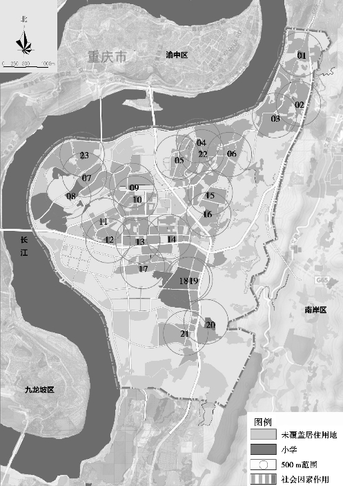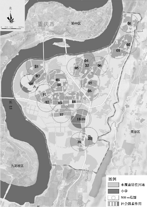 ①研究区域小学分布情况。南岸区南坪片区共计有23所中小学,由于历史原因,沿着江南大道两侧最早发展的片区小学较为集中,而外围则相对稀疏。研究区域中,23所中小学的现状空间阻隔情况和空间分布分别如图5.24和图5.25所示。为了便于研究,将校园进行统计编号,具体见表5.7。