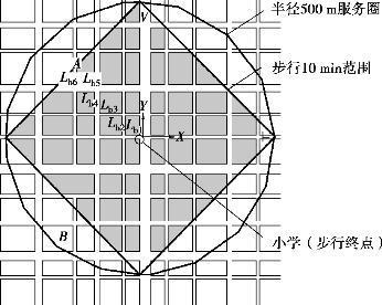道路交通要素首先对出行的时间与金钱成本起主导作用,其次是土地利用的影响,所以城市道路交通是影响学校步行可达的首要因素。出行的个体和校园存在空间位置上的分离,由此产生出行需求,出行者需要通过某种方式来克服时间和空间的阻力,城市道路交通系统就需要应对这种需求。因此,到达学校的步行可达性和学校周围的交通网络直接相关,可以发现城市道路网络系统越发达,可供居民到达校园的路径选择就越多,这表明校园的步行可达性往往就高;反之,则低。通常居民到达校园的路径有很多,但不同的路径所花费的交通成本存在差异,一般情况下会选择其中交通成本较低的那一条路来进行可达性的测算。不同城市或者同一城市不同片区的路网格局是不一样的,这对适宜步行网络的区域也产生一定程度的修正。在城市中行走,人们的步行主要受道路分布的(包含街道、小巷和广场)影响。在平原城市中,片区道路网络主要由近似直角相交的棋盘式格局构成,所以本研究中以这种理想的道路模型为基础,研究人在城市路网中行走的步行可达范围的形状变化。数据收集包括:一是正交路网下的步行合理可达范围,在以直角相交的理想化棋盘式路网中,假设人们步行的起始点恰好在路口,那么人们从步行起始点沿道路行走,向图中的Y方向行走10 min可到达500 m处的V点,而向X方向行走10 min可到达500 m处的H点。但是若目的地不在X方向或Y方向这种直路上的点,例如图中的A点,那么就需要按照道路网络不断曲折前行。从步行的起始点到A点的实际距离,就是在所有路途中的距离之和,即:Lb=Lb1+Lb2+Lb3+…+Lb6,亦是。根据平面几何学原理中的直角三角形“斜边小于两个直角边之和”原理,可以得出A点和起始点之间的直线距离要小于路途距离,那么假如到达A点的实际距离是500 m,直线距离就一定小于500 m。所以可以得出在道路网络模型中,合理步行的可达范围肯定不是一个圆形。若到达一个点的最短实际距离大于500 m时(如图中B点),那么这个点可判别为不在合理的步行可达范围之内。另一方面,若最短实际的路途距离等于500 m的点则可判别为是合理的步行可达范围的临界点,那么集合各个方向上的这些临界点就可以形成步行合理可达范围的一条完整的边界线。具体来说,假若选用的是理想化棋盘式路网模型,道路都是以直角相交,出行者要么沿X方向行走,要么沿Y方向行走,就可把路途分为X方向路途和Y方向路途,而总路途的实际距离可以表达为