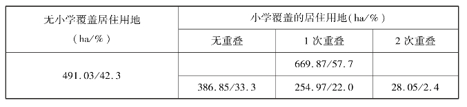 ②小学社会需求力对步行网络可达性影响评价。在社会空间的作用下其居住用地覆盖面积为656.52 ha,占总居住用地面积的56.6%,而未覆盖的居住用地面积为504.38 ha,占总居住用地面积的43.4%(表5.13)。