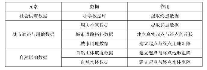 ①小学数据库:小学的名称、校园的用地、教师与班级的数量、校园的入口等相关要素,考虑重庆山地城市地貌表现出来的特殊性,将小学校园可进入点即校园入口作为源点,认为到达小学的入口即当作进入小学内部,并以此为依据建立代表小学入口的点文件。