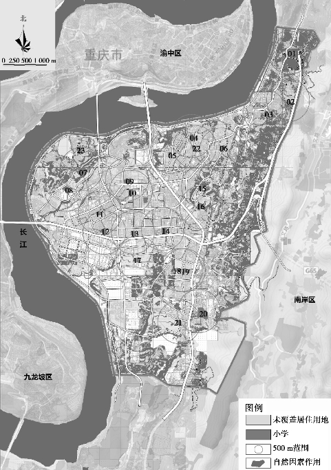 研究所需的城市用地和道路基础数据均来源于重庆市规划局电子平台以及项目组积累的数据;通过Google Earth获取城市山水地貌,并利用ERDAS 8.7进行图像的几何校正,再结合实地踏查情况利用ArcGIS 11.0提取影响步行的山水地貌特征信息;社会需求则采用片区现状用地图进行统计分析,学校数据则利用百度百科现行查阅,并进行实地探访确保真实可靠性(表5.6)。