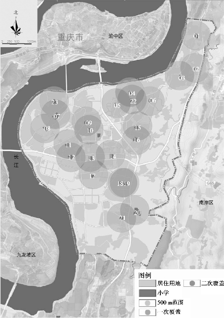图5.26 无空间阻隔下23所小学500 m半径覆盖图