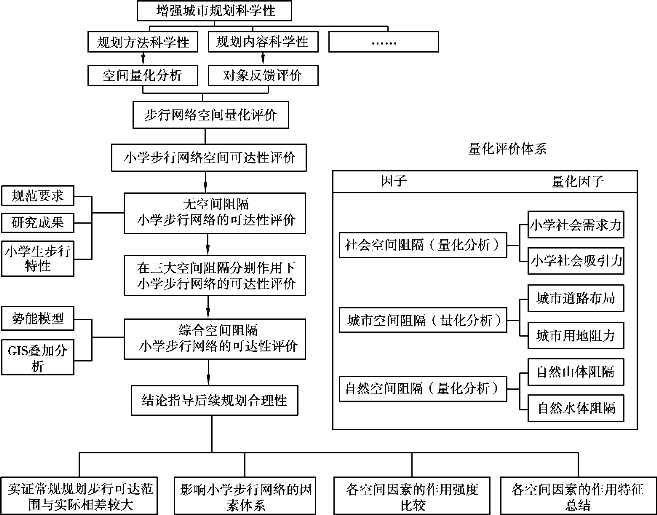 城市中小学作为一种重要的公共服务设施,是一个城市实力与服务好坏的重要体现,是关联广大百姓群众自身利益的基础,是保障经济、社会、各项事业健康和谐发展的前提,关系到一个城镇的发展程度和方向。而当前中小学等基础设施建设过程中面临着规划布局不平衡、选址不方便等难题,对城乡规划工作者提出了更高的要求,需要应用最新、最先进的科技与方式使城乡规划从定性化走向定量化设计。为了提高中小学的教育设施使用效率,促使每个学生都能平等、自愿地选择步行作为上下学的主要交通方式,在优化设施布局和提高设施的服务质量过程中,中小学生步行网络的可达性成了重要的衡量指标。因此,提出应以步行500 m可达来度量小学服务范围,改变以往习惯采用的“500 m为半径圆形”方式,以无空间阻隔作为步行网络可达性评价的基础,从社会空间、城市空间、自然空间3个方面进行步行网络可达性的研究,得出影响步行网络可达性的主要因素和作用机制。