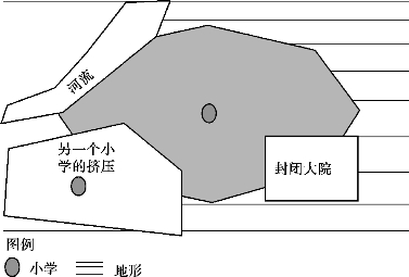 土地使用阻力的思考,需要从土地的两个角度入手:一是用地性质(如居住、工作、商业、文化娱乐、绿地等);二是土地的空间分布(杨育军 等,2004)。在具体研究中,校园周边土地类型大致可分为两类:一类会增强步行至校园的积极效应,增加学生对校园的步行可达性,而另一类则会对步行至学校产生消极效应,学生只能通过绕行实现。本研究中的土地使用主要是指步行发生点和吸引点之间土地类型、空间分布(小学生到达小学路途上土地的类型与空间分布)。如果校园周边土地类型是道路、公共绿地、开放型居住区、开放性文娱区则会对步行至校园产生积极的外部效应,增加学生对校园的步行可达性。相反,如果校园周边是工业区、仓储区、封闭的居住区或者封闭的行政办公区,则会对步行至学校产生消极效应,学生只能通过绕行实现。数据采集:第一,从直观上就可以知道受土地利用布局影响下的步行可达范围,在步行行进中,若遇到地面铁路、大面积围墙(如厂区、收费公园、封闭式管理的住宅区等)或者是大型建筑物等较大范围的障碍物时,步行的可达范围就会受到较大规模的压缩(图5.33);第二,根据不同的研究出发点确定土地的阻力值。