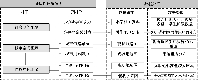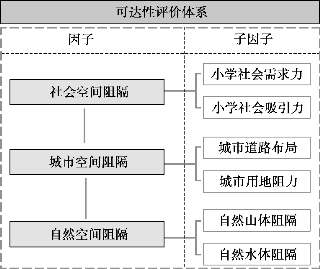 本研究采用广义可达性概念下的指标评价体系,其中包含了广义可达性和狭义可达性下的指标,还新增了两个社会属性的指标,即在广义可达性的概念下,评价指标体系内包含道路布局、用地分布、自然山体、自然水体、社会需求力以及社会吸引力6个子因子。本研究根据因子的属性不同、所属类别不同,又将6个子因子概括为三大方面,分别为社会空间阻隔(包含小学社会吸引力、小学社会需求力)、城市空间阻隔(包含城市道路布局、城市用地阻力)、自然空间阻隔(包含自然山体阻隔、自然水体阻隔),以便于分类讨论与研究(图5.27)。