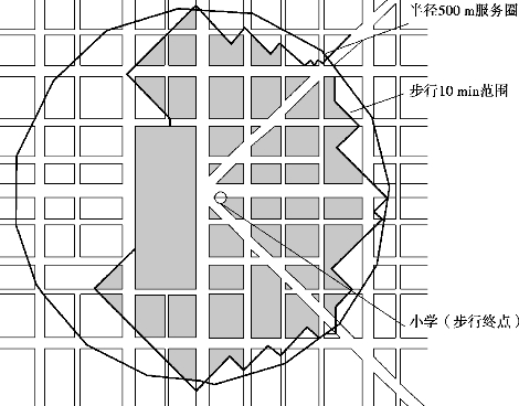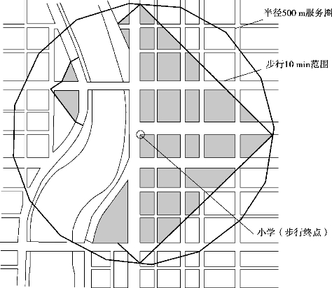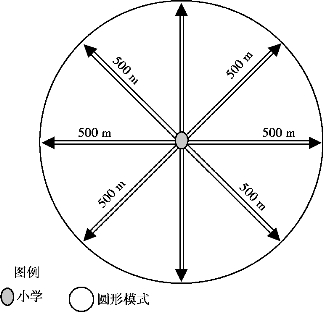 ①基于平地多向均衡效应,常规的公建可达性的范围往往简化为圆形模式。通常居住区各类型公建可达性(包含小学)的范围都采用圆形模式——服务半径来表示,居住区公建(包含小学)合理的服务半径指居住区居民到达公建的最大步行距离。当然不同级别的公建应有不同的服务半径。