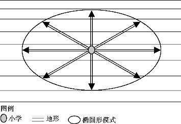 首先,由圆形模式过渡到椭圆模式(图5.44)。重庆是代表性的山地城市,山地城市由于其地形变化特征,注定了居住区公建会受地形的影响受到不同方向上的非均衡阻隔效应,即沿着等高线受阻隔的影响度小于垂直等高线受阻隔的影响度,因此圆形的范围模式会有所压缩,变化成椭圆模式。